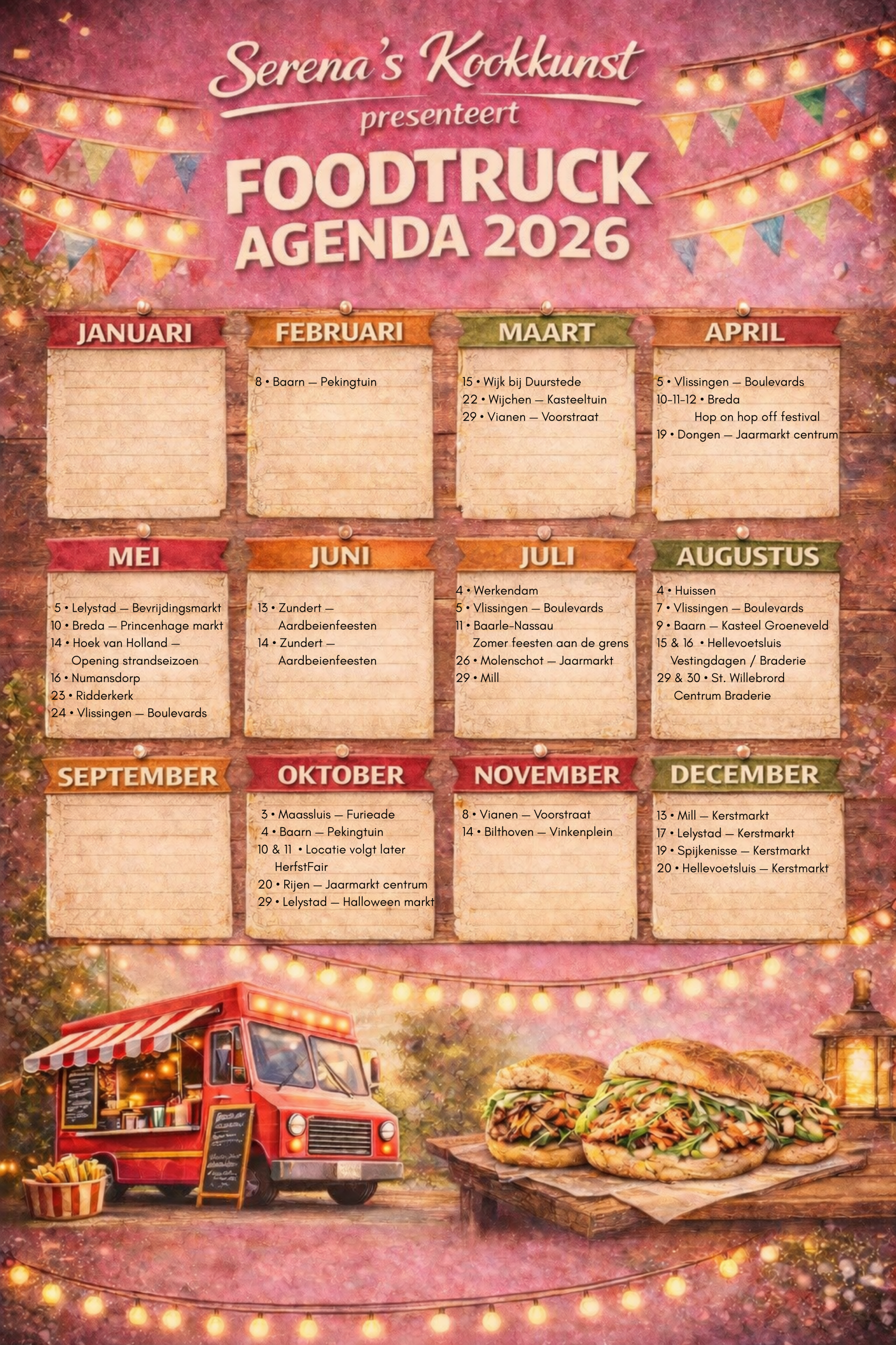 Wij pakken onze truck weer in voor een nieuwe culinaire stop. Naast onze klassiekers hebben we soms seizoensgebonden specials die je niet wilt missen. Kom langs en ontdek jouw nieuwe favoriet! Houd de agenda in de gaten voor alle details en kom proeven wat Serena’s Kookkunst te bieden heeft.